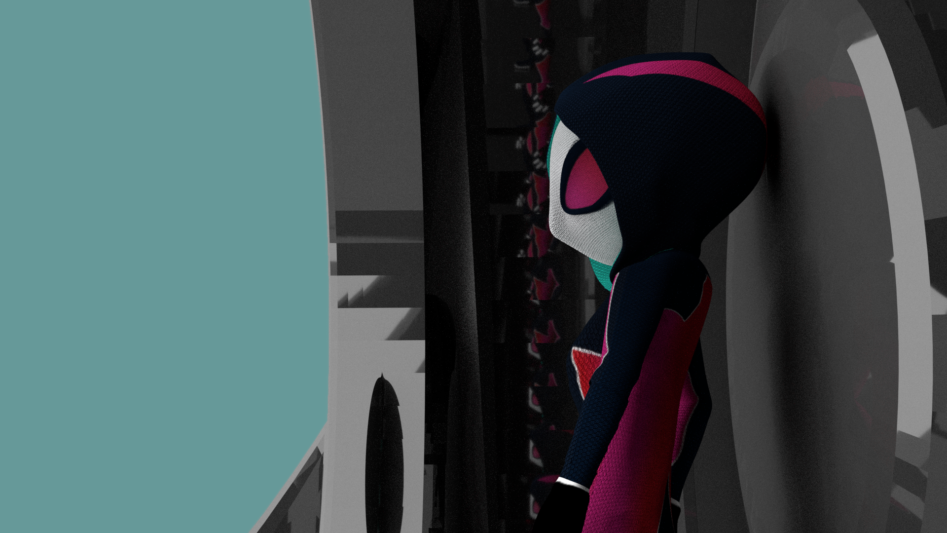 A miniature 3D Model of 'Spider Gwen' from 'Into The Spider Verse.' Modelled and rigged in